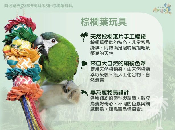 破壞型玩具的特性 .滿足鸚鵡天生擁有的啃咬咀嚼、鑿洞天性 .藉由破壞玩具發洩精力、釋放壓力,建立自信心 .在破壞過程中體驗不同材質觸感與視覺感官,生活更有樂趣 .減少無聊咬毛、尖叫等負面心理行為