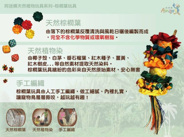 破壞型玩具的特性 .滿足鸚鵡天生擁有的啃咬咀嚼、鑿洞天性 .藉由破壞玩具發洩精力、釋放壓力,建立自信心 .在破壞過程中體驗不同材質觸感與視覺感官,生活更有樂趣 .減少無聊咬毛、尖叫等負面心理行為