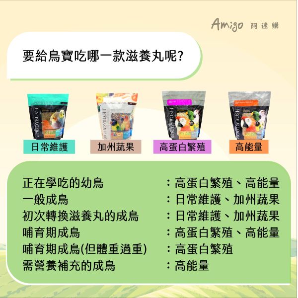 滋養丸成分天然、口味豐富且顆粒多元,適合不同體型的鳥寶食用,也方便儲存。