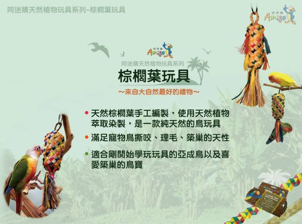 破壞型玩具的特性 .滿足鸚鵡天生擁有的啃咬咀嚼、鑿洞天性 .藉由破壞玩具發洩精力、釋放壓力,建立自信心 .在破壞過程中體驗不同材質觸感與視覺感官,生活更有樂趣 .減少無聊咬毛、尖叫等負面心理行為